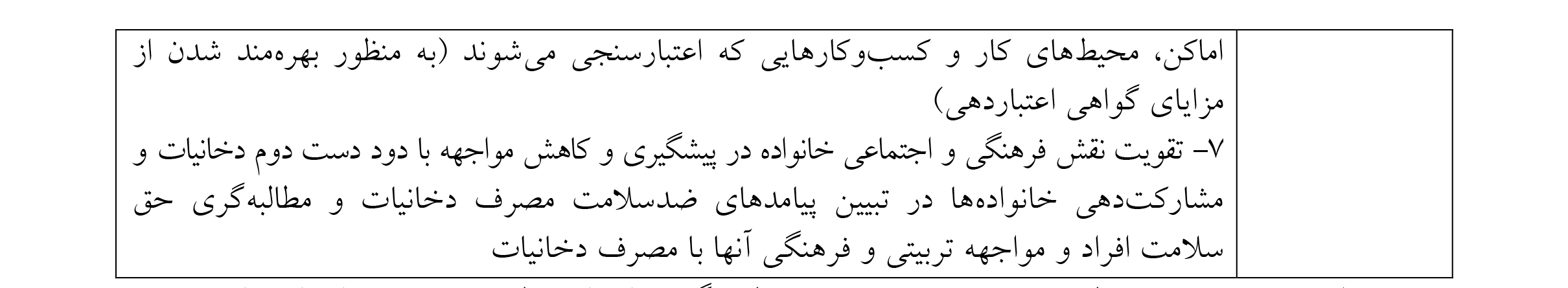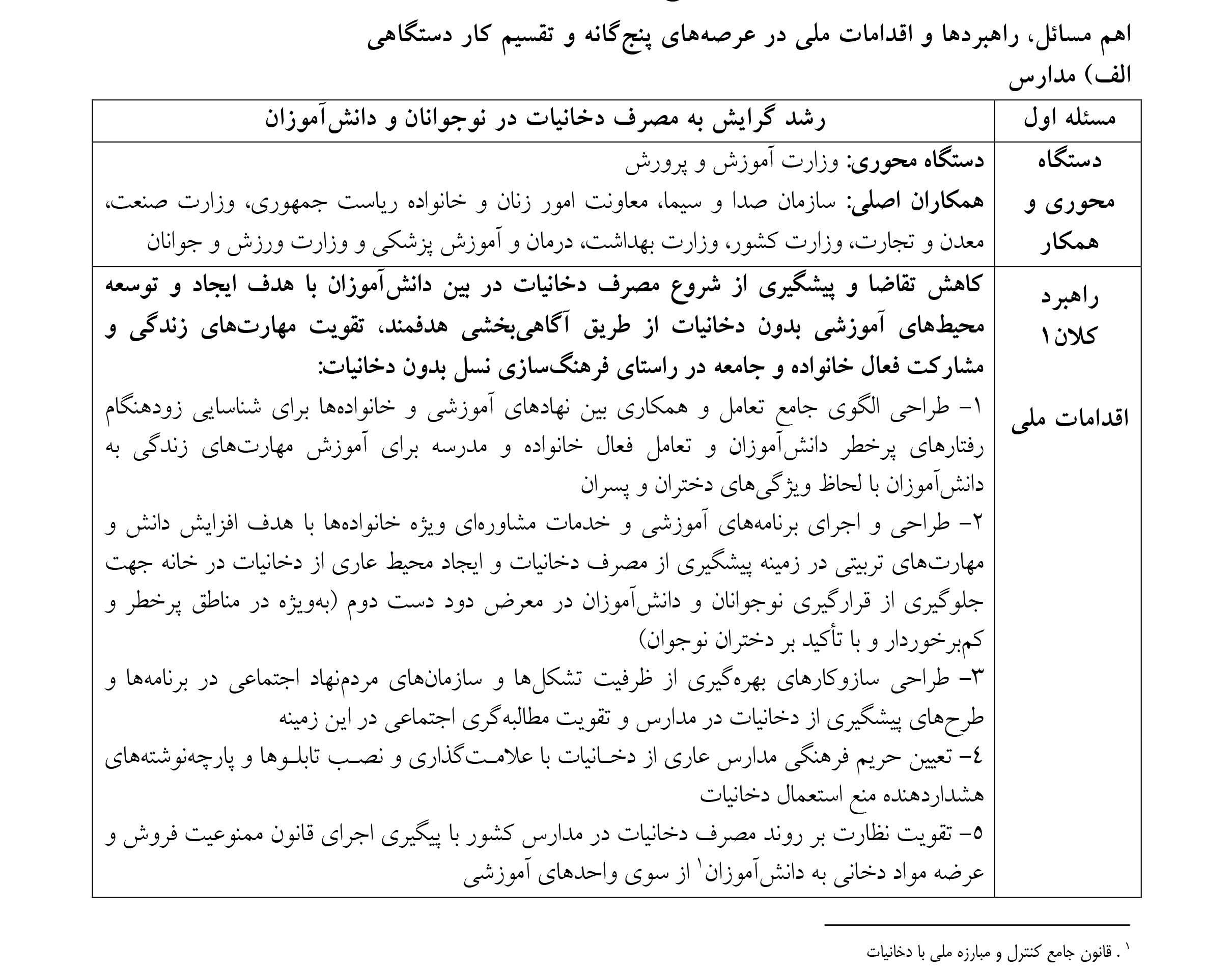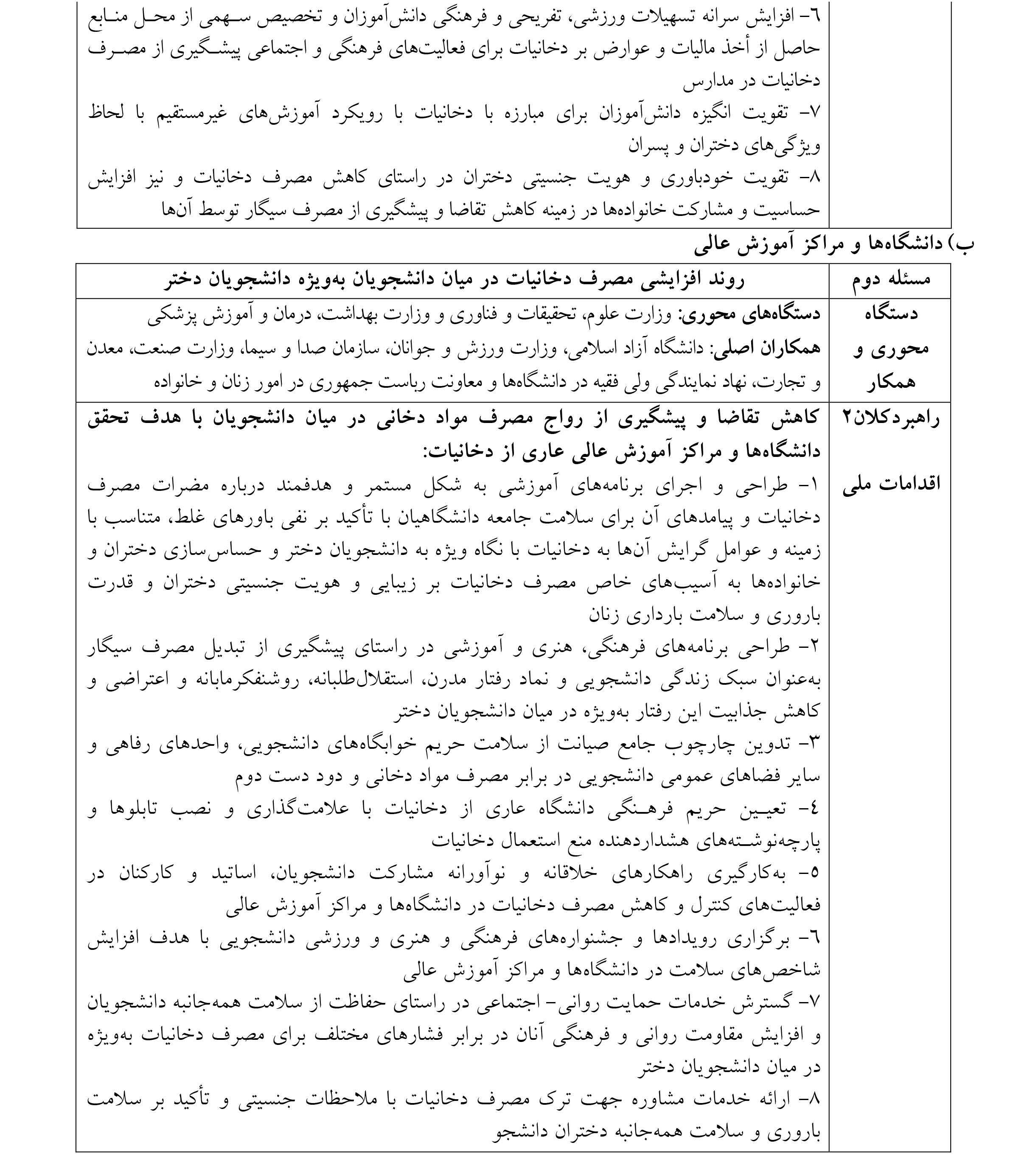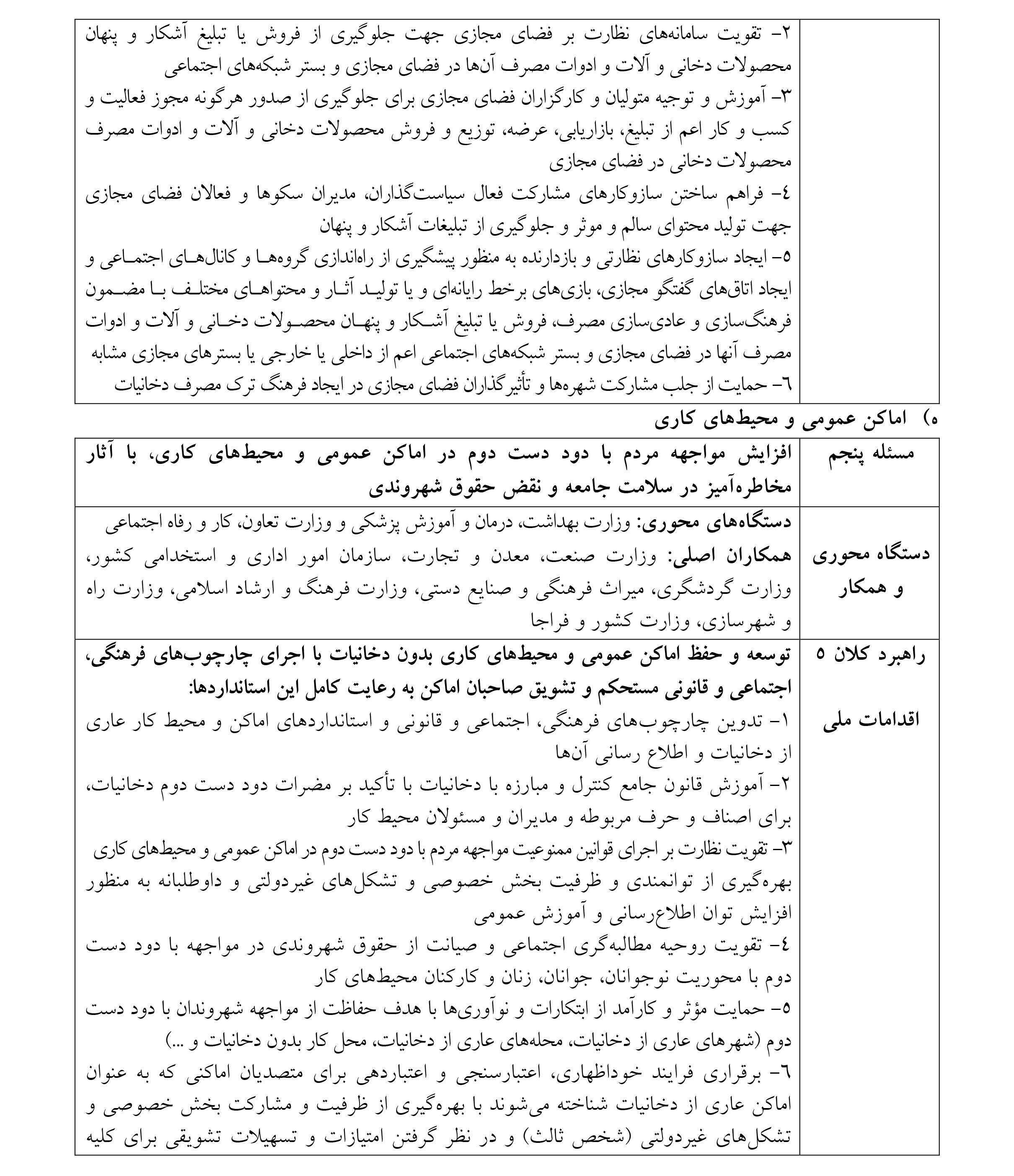 رویکرد فرهنگی و اجتماعی به موضوع مصرف دخانیات را میتوان به عنوان مکملی بر قوانین موجود در این عرصه و دریچهای نو در برنامه کنترل و مبارزه ملی با دخانیات در کشور دانست. در این راستا، این مصوبه بر پنج عرصه اولویتدار، شامل: مدارس، دانشگاهها و مراکز آموزش عالی، آثار و تولیدات چندرسانهای، فضای مجازی، اماکن عمومی و محیطهای کاری با هماهنگی و مشارکت دستگاهها، خبرگان، فعالان و گروههای مردمی فعال در حوزه پیشگیری و مقابله با مصرف دخانیات، به شرح ذیل تمرکز دارد