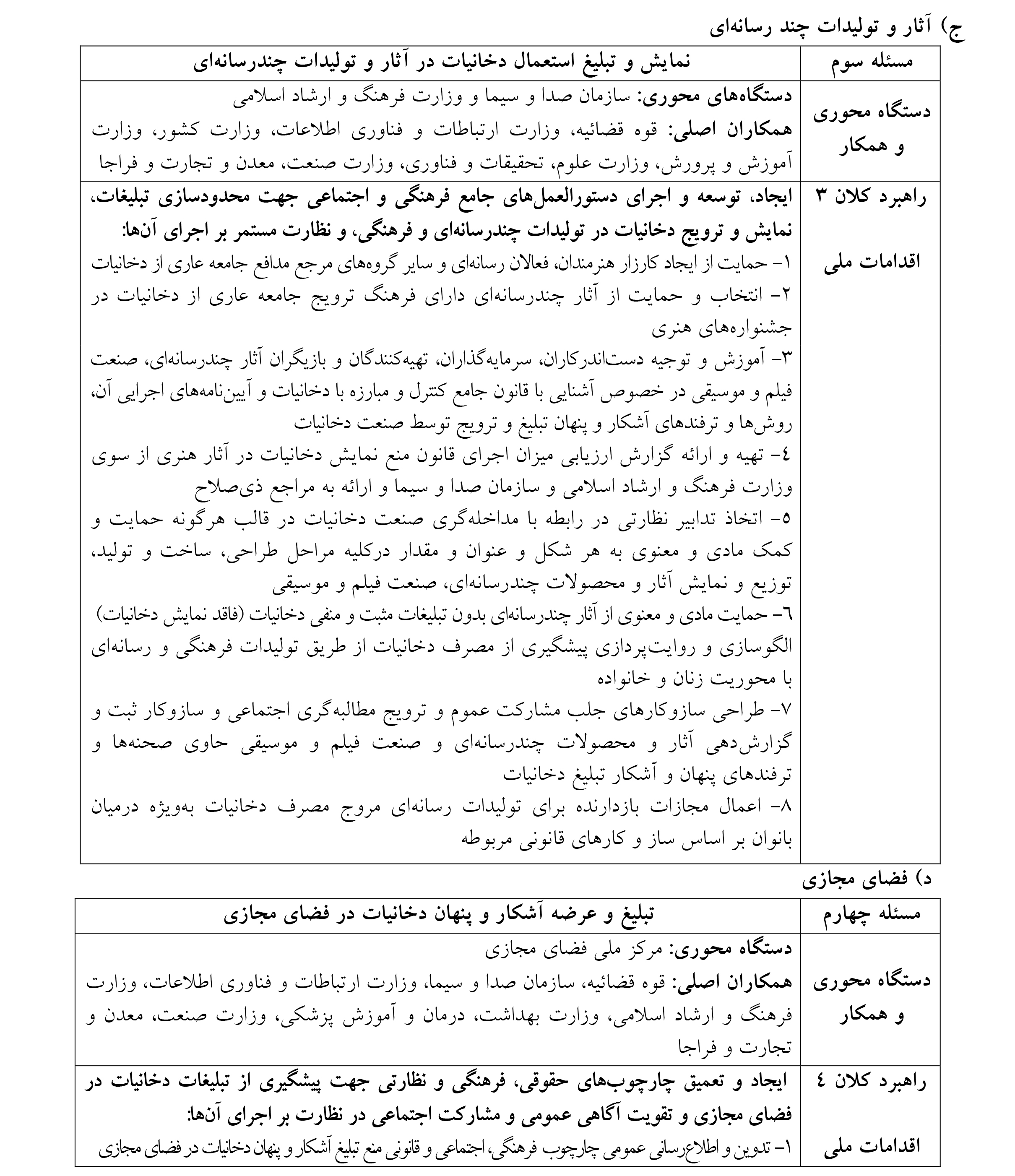 تبصره 3 - دستگاههای محوری در اجرای راهبردها و اقدامات فوقالذکر از ظرفیت سایر دستگاههای ذیربط و گروهها و تشکلهای مردمی استفاده میکنند.