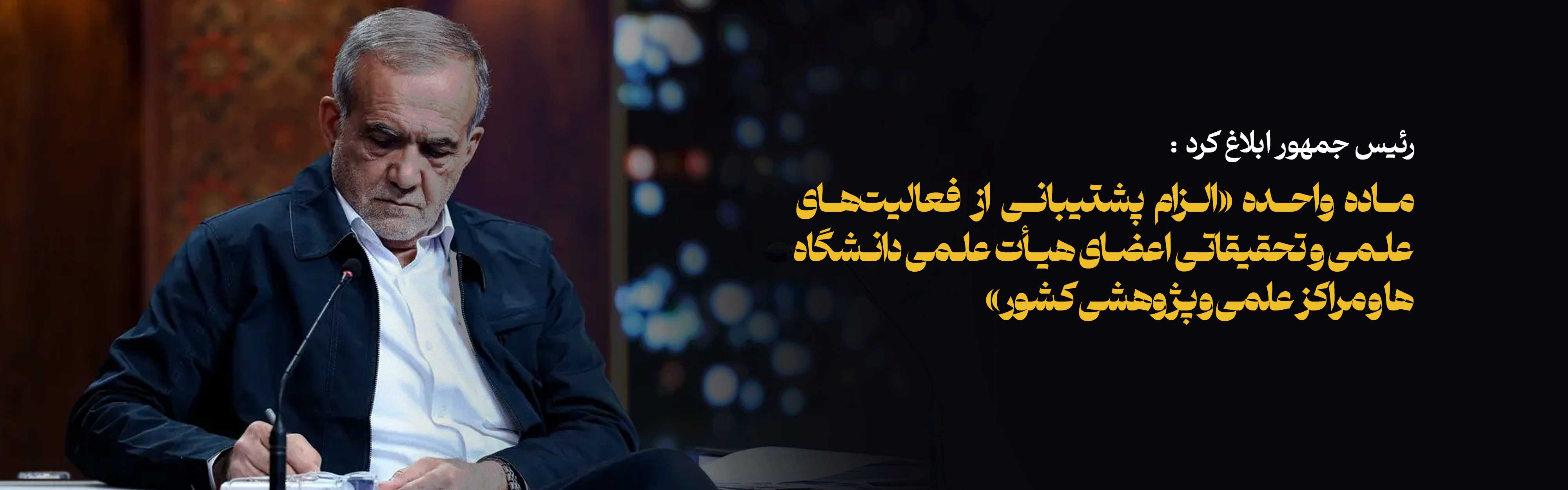 دکتر مسعود پزشکیان، رئیس شورای عالی انقلاب فرهنگی ماده واحده «الزام پشتیبانی از فعالیتهای علمی و تحقیقاتی اعضای هیأت علمی دانشگاهها و مراکز علمی و پژوهشی کشور» که در جلسه 919 مورخ 13/03/1404 شوراي عالي انقلاب فرهنگي بهتصویب رسیده است، را برای اجرا ابلاغ کرد.