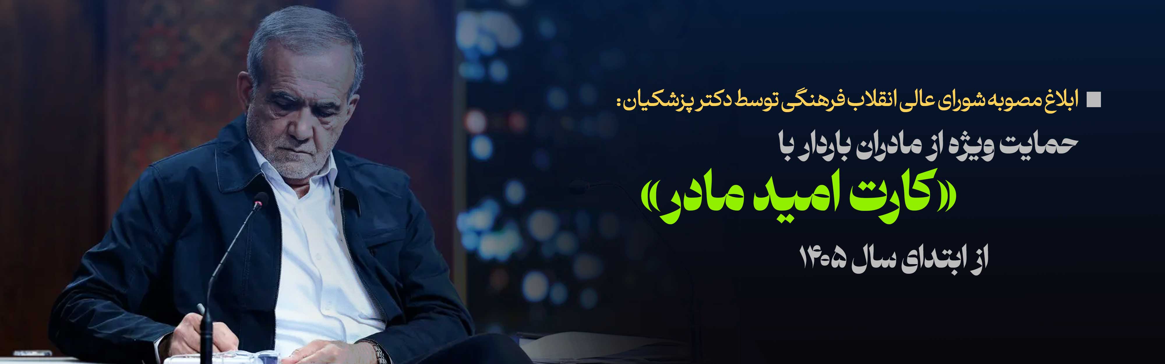 دکتر مسعود پزشکیان، رئیسجمهور و رئیس شورای عالی انقلاب فرهنگی، مصوبه «الزامات و راهکارهای بهبود وضعیت جمعیت کشور» را که در جلسه ۹۲۰ شورای عالی انقلاب فرهنگی به تصویب رسیده است، ابلاغ کرد. بر این اساس در راستای سیاستهای کلی جمعیت ابلاغی مقام معظم رهبری(مدظلهالعالی) و به منظور حمایت مادی و فرهنگی از خانواده و ارتقای سلامت مادر و کودک؛ کلیه مادران باردار کشور که از تاریخ 1405/01/01 فرزند خود را به دنیا میآورند، مشمول دریافت «کارت امید مادر» خواهند بود، که این کارت به مدت ۲۴ ماه، ماهیانه بیست میلیون ریال شارژ خواهد شد.