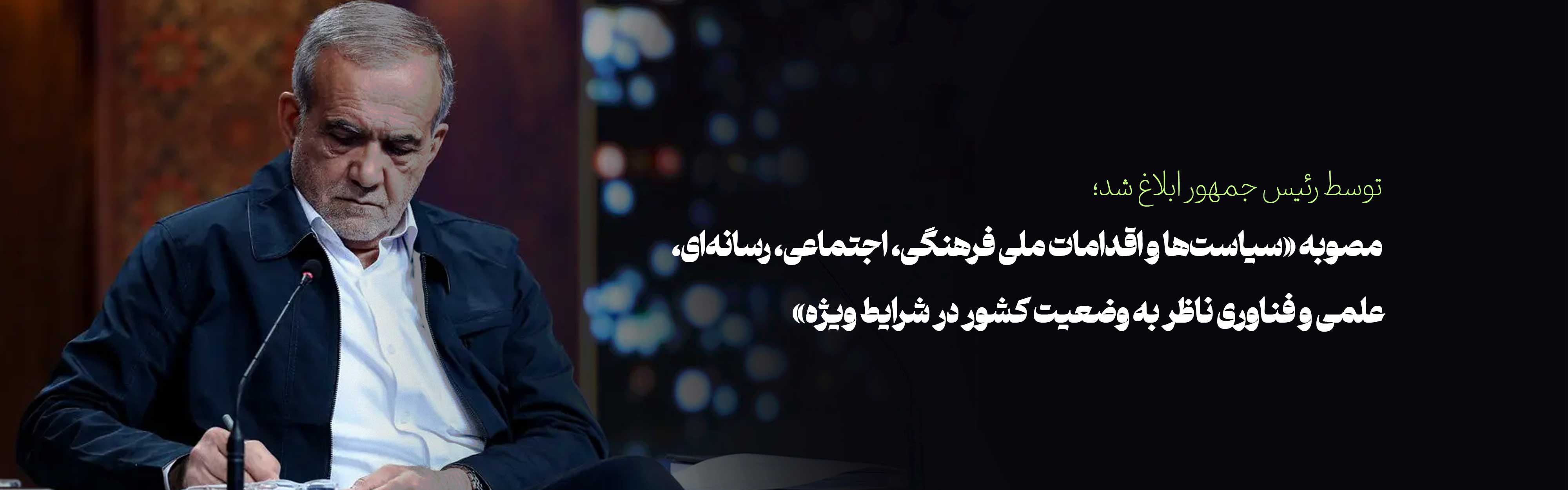دکتر مسعود پزشکیان رئیس شورای عالی انقلاب فرهنگی مصوبه «سیاستها و اقدامات ملی فرهنگی، اجتماعی، رسانهای، علمی و فناوری ناظر به وضعیت کشور در شرایط ویژه» که در جلسه 920 مورخ 1404/06/04 شوراي عالي انقلاب فرهنگي بهتصویب رسیده است، را برای اجرا ابلاغ کرد.